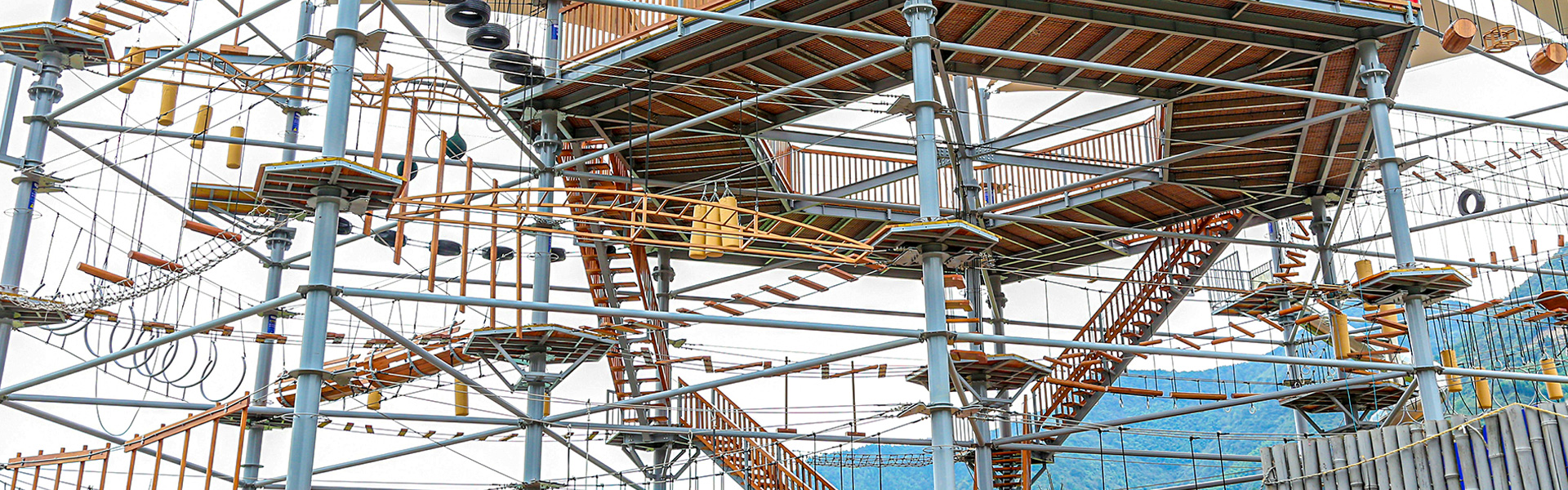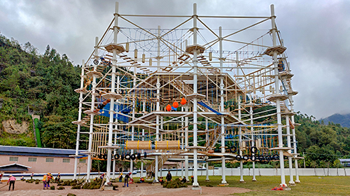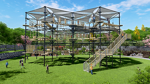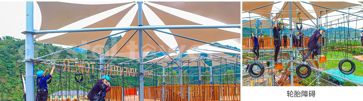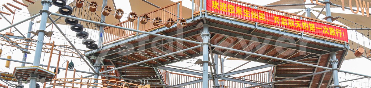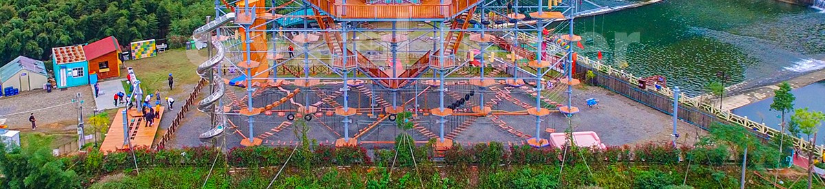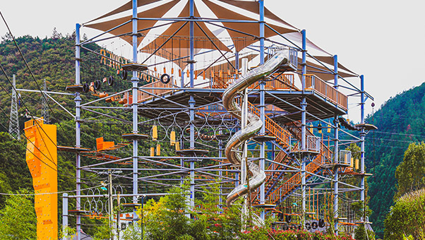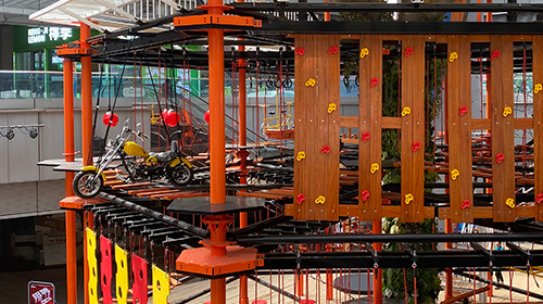 單層高達 4.3m,總高達 19.8m,內(nèi)部以晶體結(jié)構(gòu)搭建架空層 1-4 個步道層級,打造超過 680m 長的空中游樂路線,開模制作,國內(nèi)獨一無二,雙重保護更安全,利用防呆裝置做到安全萬無一失。其中包含 87 個運動項目(包含尖叫滑梯、巨形秋千、低空蹦極),能滿足 150 個游客同時進行冒險體驗,被譽為 " 運動游樂之王 "。