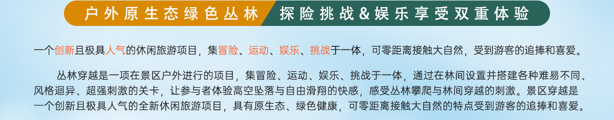 叢林穿越,結(jié)合景區(qū)獨(dú)有的茂密叢林,結(jié)合爬、滑、游、跨、跳、飛等運(yùn)動(dòng),從游客的感受和文化體驗(yàn)出發(fā),致力于設(shè)計(jì)和開發(fā)具有創(chuàng)新性的運(yùn)動(dòng)項(xiàng)目。以滿足不同游客的需求和興趣。我們?yōu)槊恳粭l步道設(shè)計(jì)了獨(dú)特的主題和路線,為游客營(yíng)造完美的感官體驗(yàn)。使游客在感官體驗(yàn)上得到升華,同時(shí)深入了解自然和文化的魅力。