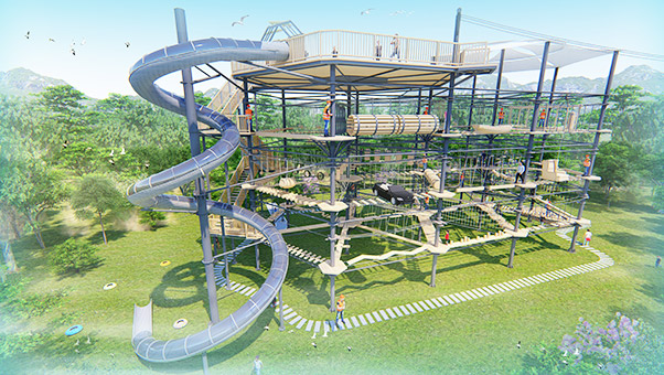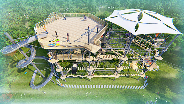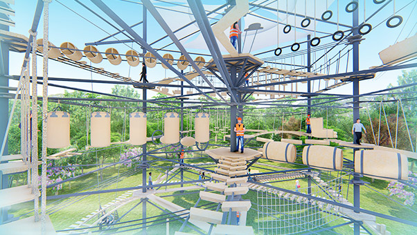 本項(xiàng)目建于戶外自然景區(qū)(亦可在室內(nèi)搭建),配置上百種運(yùn)動(dòng)健身、探險(xiǎn)互動(dòng)項(xiàng)目,項(xiàng)目游樂步道設(shè)有不同難度系數(shù)的項(xiàng)目供游客體驗(yàn),是景區(qū)中一個(gè)創(chuàng)新性、地標(biāo)性的立體娛樂綜合體。該設(shè)備占地面積達(dá)到800㎡,綜合用地面積達(dá)1000㎡,單層高達(dá)4m,內(nèi)部以晶體結(jié)構(gòu)搭建架空層1-4個(gè)步道層級,打造層超過1m長的空中游樂路線。