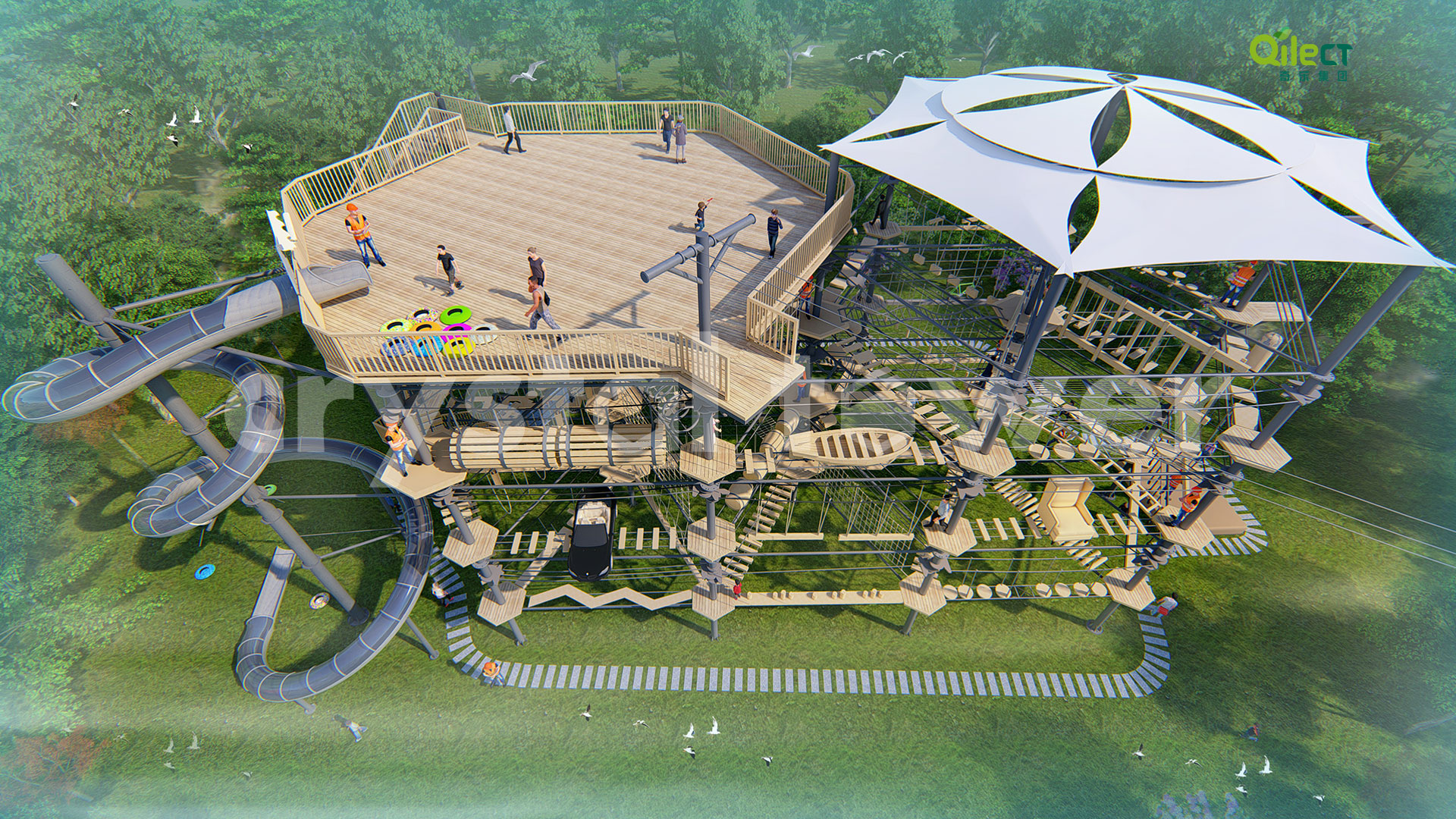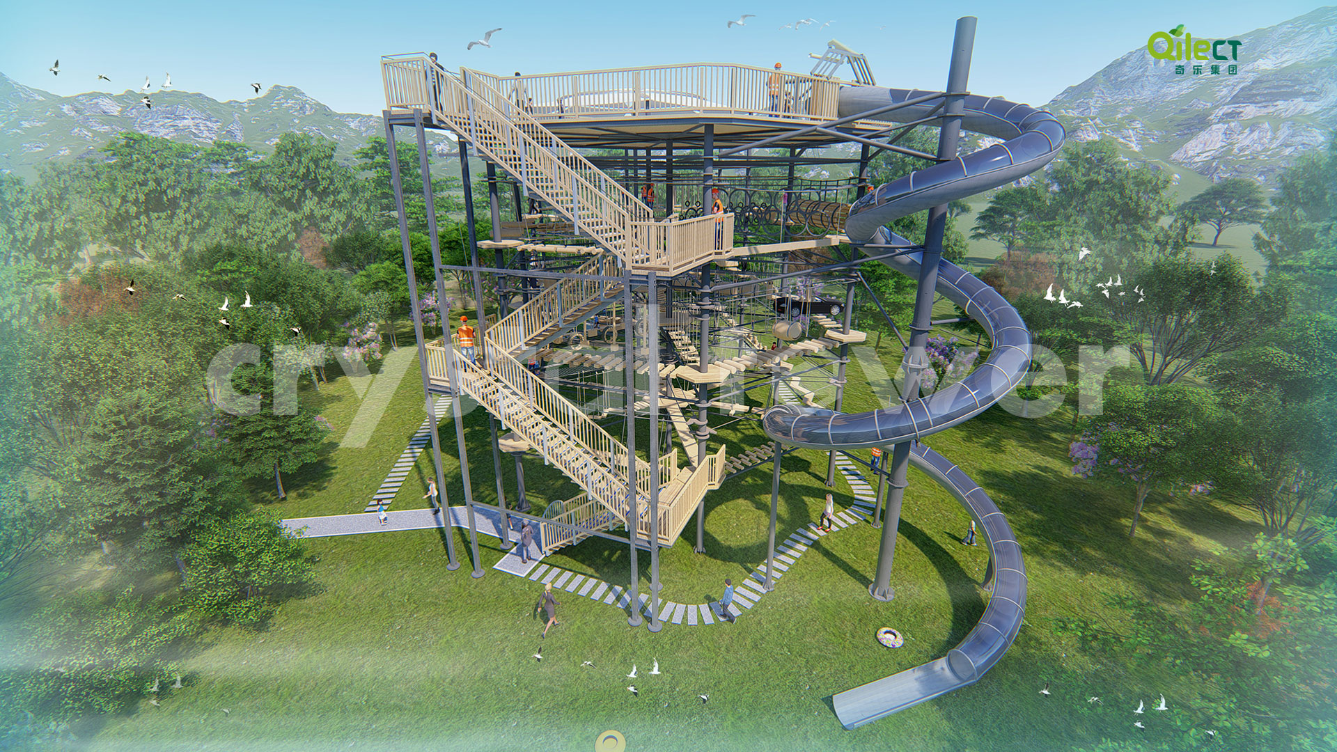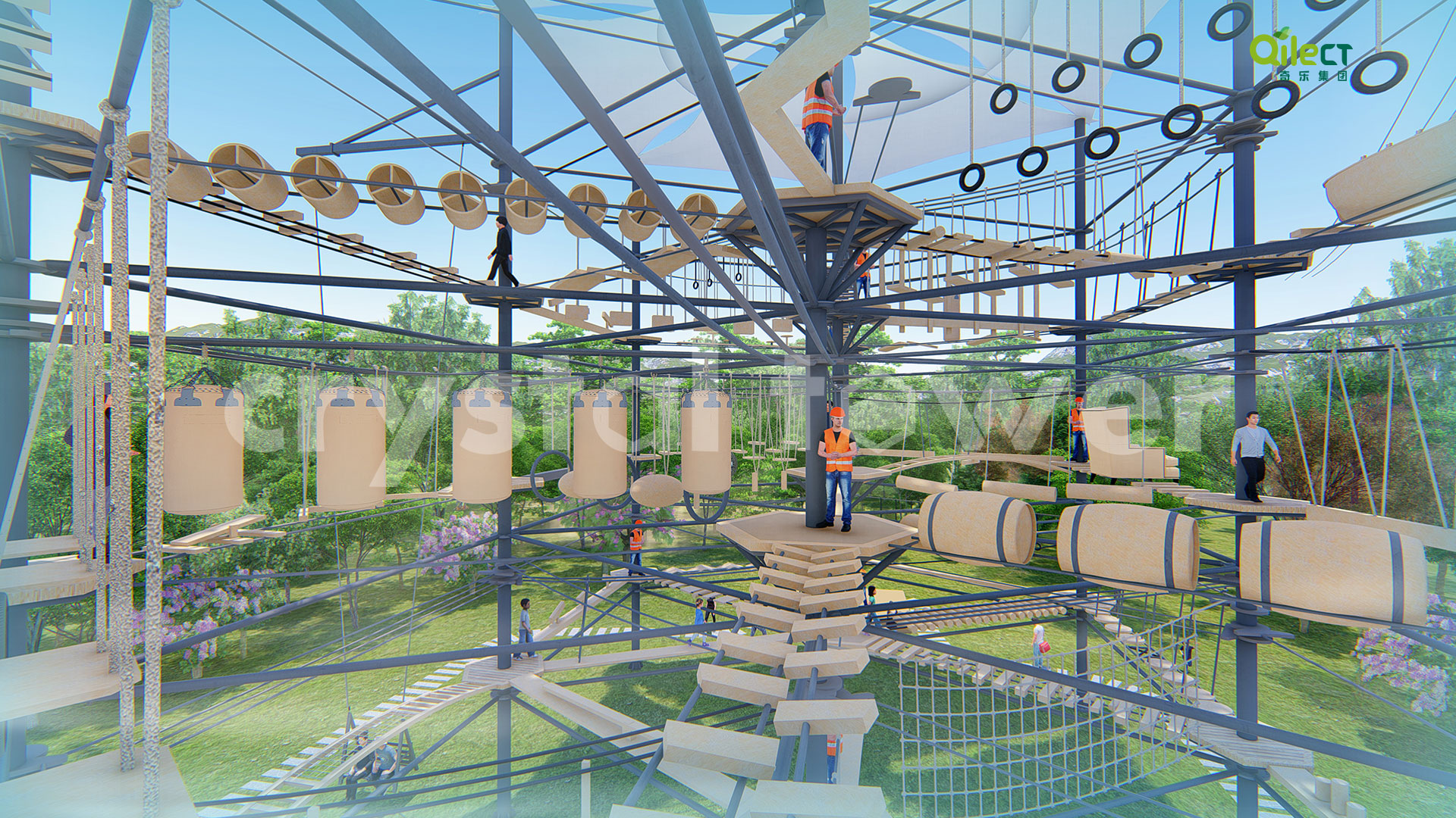 本項(xiàng)目建于戶外自然景區(qū)(亦可在室內(nèi)搭建),配置上百種運(yùn)動(dòng)健身、探險(xiǎn)互動(dòng)項(xiàng)目,項(xiàng)目游樂(lè)步道設(shè)有不同難度系數(shù)的項(xiàng)目供游客體驗(yàn),是景區(qū)中一個(gè)創(chuàng)新性、地標(biāo)性的立體娛樂(lè)綜合體。該設(shè)備占地面積達(dá)到800㎡,綜合用地面積達(dá)1000㎡,單層高達(dá)4m,內(nèi)部以晶體結(jié)構(gòu)搭建架空層1-4個(gè)步道層級(jí),打造層超過(guò)1m長(zhǎng)的空中游樂(lè)路線。